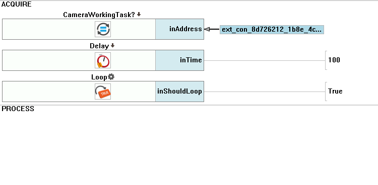 Go back to the Main macrofilter. Mark all the filters, right click on them, and choose Extract Task (loop) from the pop-out menu. Name the new Task CameraWorkingTask. The created macrofilter should be placed in the Acquire section. Create the macrofilter input of variant GevAddress type. Name it inAddress.