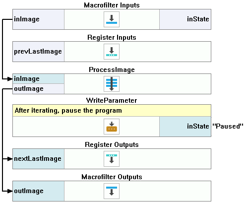• Connect the Image output of the ProcessImage with the nextLastImage register and the macrofilter output.