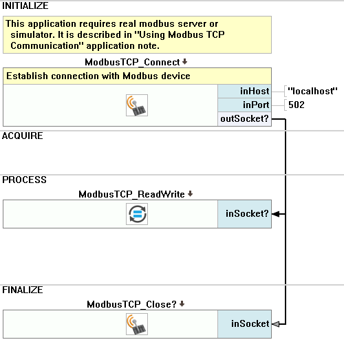 The application shows how to configure a simple Modbus TCP connection. It requires a real Modbus server or simulator. Details are described in the "Using Modbus TCP Communication" application note.