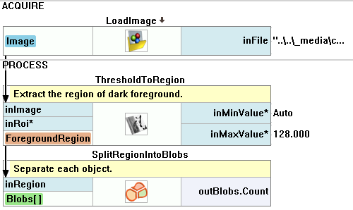 - To extract objects from the image add the ThresholdToRegion filter to the PROCESS section and set the value of the inMaxValue to 128 and the inMinBlobArea set to Auto.