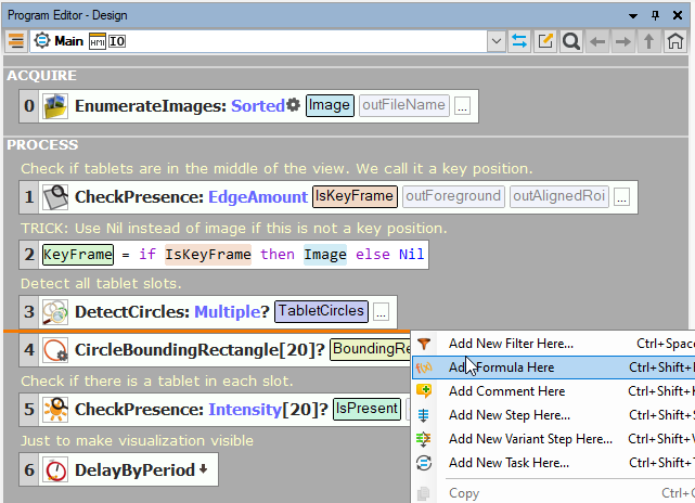 - New: With Variant Steps and registers it is possible to program Finite State Machines in a very convenient way. Thus, it is much easier to create programs that work is several modes of operation (e.g. "Model Definition", "Inspection On", "Inspection Off", "Result Analysis").