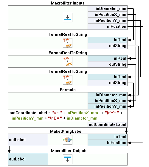 - Add the MakeStringLabel filter. Connect the inText input to the macrofilter's Axis input. Connect the inPosition input to the Point2 output of the previous filter. Drag the outLabel output to the Macrofilter Outputs section to create a new output.
