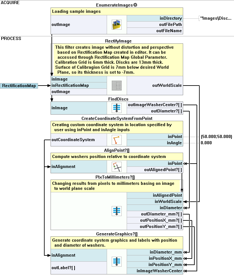- Connect each PixelsToMillimetres outputs to the macrofilter's output and name them: Diameter_mm, PositionX_mm and PositionY_mm.