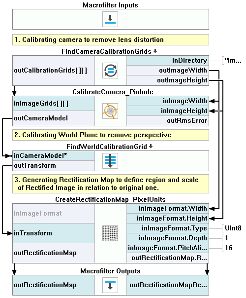 Return to the Calibration macrofilter. Add the CalibrateCamera_Pinhole filter. Connect its inputs with the FindCameraCalibrationGrids outputs.