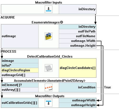 - Add the AccumulateElements filter, connect its input with the DetectCalibrationGrid_Circles output. Drag the output to the Macrofilter Outputs section and name the new macrofilter output CalibrationGrids.