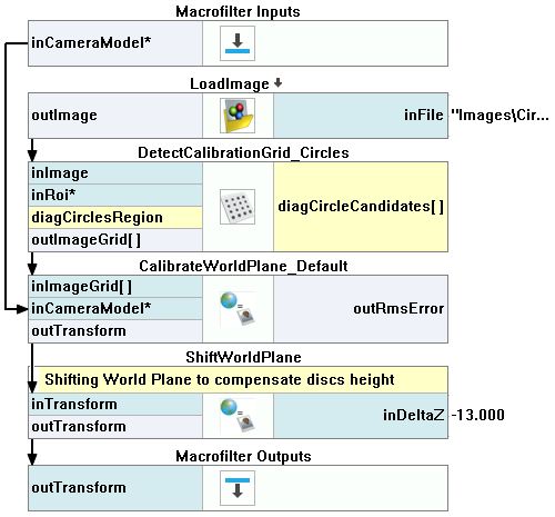 - Add the ShiftWorldPlane filter, connect its inTransform input with the CalibrateWorldPlane_Default outTransform output. Set the inDeltaZ to -13. Drag the outTransform to the Macrofilter Outputs section.