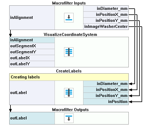 Inside the GenerateGraphics create 2 Step macrofilters and name them VisualizeCoordinateSystem and CreateLabels. Drag the Alignment macrofilter input to the VisualizeCoordinateSystem step and all the rest of the inputs to the CreateLabels.