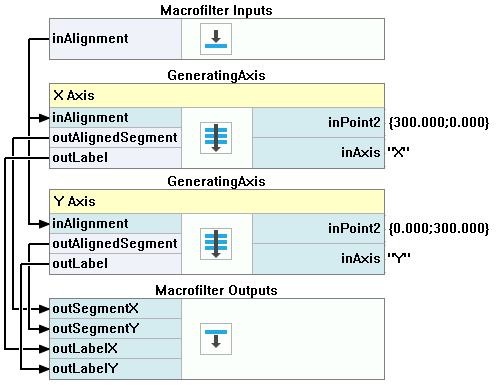 - Add the MakeStringLabel filter. Connect the inText input to the macrofilter's Axis input. Connect the inPosition input to the Point2 output of the previous filter. Drag the outLabel output to the Macrofilter Outputs section to create a new output.
