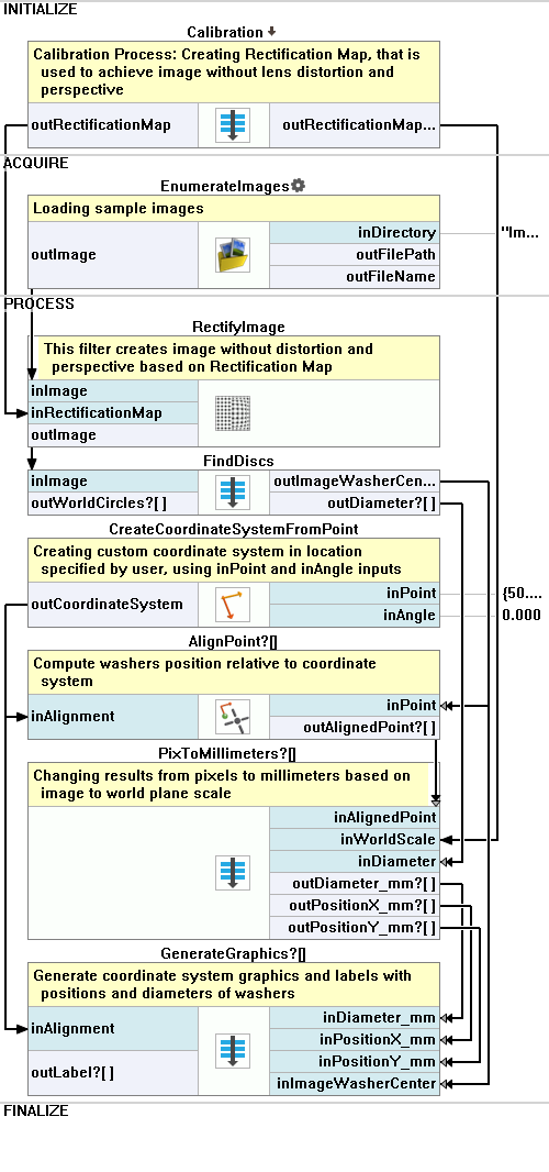 - Connect each PixelsToMillimetres outputs to the macrofilter's output and name them: Diameter_mm, PositionX_mm and PositionY_mm.