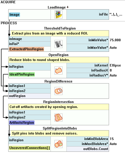 2. Extract pins from the image using ThresholdToRegion. Edit the inRoi input creating a region that covers the left side of the pins. Set inMinValue to 75.0: