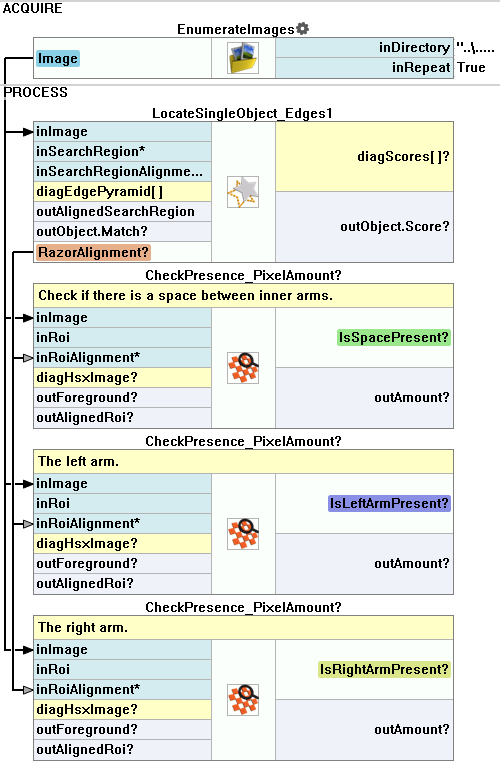 5. Add three PassFailIndicator HMI controls and connect them with outIsPresent outputs of the CheckPresence_PixelAmount filter.