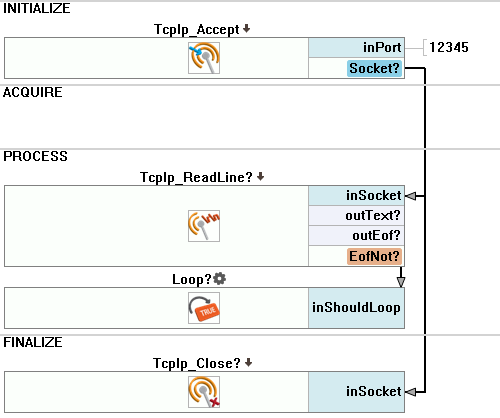 2. Turn on sections and add the TcpIp_Accept filter to the INITIALIZE section to accept the connection from the client. Rename the outSocket to Socket.